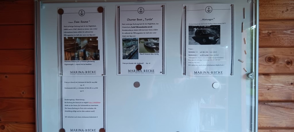 Letzter Stellplatz von unserer Nord-Tour. Diesmal hat es uns auf den Stellplatz "Marina Recke" verschlagen. Der Stellplatz sollte eigentlich der erste Platz sein den wir auf unserer Nord-Tour eingeplant hatten. Wir wollten nach Recken, weil es hier in der Nähe ein Schwefeltherme und eine Sauna gibt. Da wir unserer Tour aber abgeändert hatten, wollten wir auf jedenfall auf der Rücktour in Richtung Heimat den Stellplatz anfahren. Als wir gegen ca. 12.00 Uhr ankamen war, der Stellplatz ungefähr zur Hälfte belegt. Was für ein Glück, kurz darauf kamen dann so viele Wohnmobile, das einige wieder unverrichteter Dinge umkehren mussten. Der Platz biete ungefähr 40 Wohnmobilen Platz entweder auf dem gemeinsamen Platz oder direkt am Wasser, wobei man hier € 4,00 mehr bezahlen muss wegen der Lage. Ansonsten kostet eine Übernachtung € 13,00 und € 4,00 für Strom. Für diesen Platz ein super Preis. Am Platz ist noch ein kleines Restaurant wo man nachmittags Kaffee und Kuchen bekommt und von Donnerstag bis Sonntag wird vor Ort frisch gegrillt. Die Preise sind human und erschwinglich. Das Personal ist sehr freundlich und zuvorkommend. Auf dem Platz kann man unter anderem eine Faß-Sauna € 55,00 oder für ein ganzes Wochenende für € 150,00 mieten. Wer Lust hat kann sich auch ein keines Motorboot für max. 8 Personen mieten und das ganze Führerscheinfrei mit Treibstoff für € 60,00 pro Stunde. Da dieser Platz all das bietet was man sich denken kann, haben wir uns dann auch kurzfristig dazu entschieden, zwei Nächte hier zu bleiben und unsere Nord-Tour gemütlich ausklingen zu lassen. Morgen geht es dann wieder in Richtung Heimat mit dem Fazit, das die Tour bis auf ein paar Winzigkeiten ein schönes Erlebnis war.