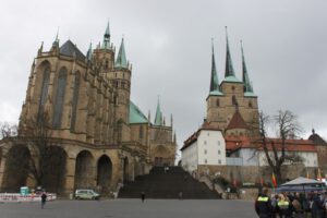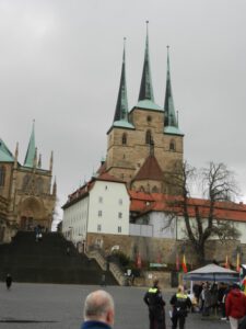 | Heute ging es nach Erfurt, aber zuerst einmal rein in die Stadt, da der Platz erst ab 13.00 Uhr angefahren werden kann. Und schon ging das Chaos los. In Erfurt einen Parkplatz zu bekommen ist eine Katastrophe. Außerhalb der angegebenen Parkhäusern, wo wir mit einen Womo eh nicht reinkommen, gibt es nur "Anwohner Parkplätze". Nach etlichen Versuchen haben wir dann etwas außerhalb der City einen Parkplatz an einem LIDL gefunden. Dann ging es in Richtung Altstadt durch kleine Gässchen und vorbei an vielen kleinen Geschäften und Sehenswürdigkeiten. Am Rathaus haben wir dann noch eine Figur von "Bernd das Brot" entdeckt und auch direkt Foto mäßig das ganze festgehalten. Danach ab zum Domplatz auf der eine kleine Demo aber mit viel Polizei stattfand. Dahinter ging es dann mit 70 Stufen rauf zum Erfurter Dom der sehr imposant und auch sehr interessant war. Unten vor dem Domplatz gab es mehrere Gaststätten, aber eine fiel uns direkt ins Auge, dass "Restaurant Schnitzlers". Ein Restaurant das man nur sehr empfehlen kann, wenn man gerne Schnitzel ist. Viele diverse Schnitzel mit ganz besonderen Beilagen, einfach Lecker. Im Anschluss ging es dann wieder zum Wohnmobil und dann in Richtung Wohnmobilplatz "Tor zur Stadt Erfurt". Der Stellplatz liegt oberhalb von Erfurt in der Nähe des Messegeländes und gut zu finden. Hier angekommen sind wir zuerstmal in die Rezeption und sind dort von einem sehr freundlichen Herrn empfangen worden und haben dort einen Platz zugewiesen bekommen. War alles kein Problem, da der Platz nur mit ein paar Wohnmobilen belegt war. Bezahlt wurde im voraus mit € 10,00 Pfand für eine Chipkarte und € 5,00 Aufladung für den Strom. Was nicht gebraucht wurde, wird am nächsten Tag wieder zurück gebucht. Die Sanitären Einrichtungen waren vom allerbesten, sauber und vielfältig. Auch die Küche mit ihren Spül- wie auch Kochplätzen, alles vom allerbesten und sehr sauber. Das einzige was ich gesucht habe, war eine Stelle zum Entsorgen der Chemietoilette, dafür gibt es aber einen Automat, der den Behälter automatisch leert. Kostenpreis normalerweise € 3,00, aber für Benutzer ist es mit der Chipkarte kostenlos. Fazit zum Platz, sehr empfehlenswert, besonders für mehrere Tage wenn man Erfurt erkunden möchte. In der Höhe des Platzes, ca. 2 min Gehweg, gibt es eine Haltestelle der S-Bahn um nach Erfurt zu kommen. |
