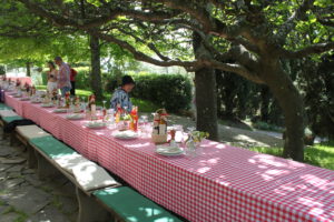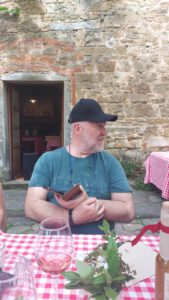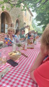 | La Vialla ist eigentlich ein italienischer Hof der diverse Erzeugnisse wie Wein, Öle, Käse und vieles mehr was die Toskana ausmacht, anbietet. Wir kannten den Hof schon länger aus dem Internet und kannten einige Produkte. Da der Hof auf unserer Route durch die Toskana lag, war es ein absolutes MUSS hier einen Halt einzulegen. Wir haben schon Anfang des Jahres angefragt, ob wir hier übernachten können und am langen Tisch teilnehmen können. Kein Problem, Termin festgelegt und Stellplatz reserviert. Heute Mittag kamen wir dann am Hof an und haben dann zuerst einmal den Stellplatz gesucht. Wer genau hinsieht kann die Schilder sehen, aber sie sind etwas klein. Auf dem Platz angekommen, waren drei Stellplätze mit einer Kette und einem Schild „Reserviert“ abgesperrt. Kurzer Anruf und man sagte uns, dass wir uns einer der reservierten Plätze aussuchen könnten. Leider waren die Stellplätze etwas schräg und trotz Auffahrkeile standen wir immer nochwas nach vorne gekippt, aber es ging. Nachdem wir den Wagen abgestellt hatten, sind wir sofort in Richtung Hof. Ein kurzer Weg von ca. 5 Minuten der aber ziemlich hoch führte, anstrengend. Ganz oben auf dem Hügel stand schon eine große Tafel für über 30 Personen. Da wir angemeldet waren, befand sich schon ein Zettel mit unserem Namen auf dem langen Tisch. Zuerst gab es einen Sekt und viele Häppchen wie Fenchelsalami, Oliven, Käse, Brot und vieles leckere mehr. Anschließend bekamen wir eine Vorspeise mit Gemüse und Ricotta Käse. Danach ein Salat und Spaghetti Bolognese. Dazu gab es Brot und einige diverse weiße, rote und rosa Weine, alle superlecker. Zum Schluss noch einen Dessertkuchen und zweierlei Grappa. Das ganze Essen dauerte etwas mehr als drei Stunden und es war war einfach klasse und besonders lecker. Das Ganze kostete pro Person € 27,00. Der Preis war für den Aufwand und die Vielfalt schon fast zu preiswert. Wer planen sollte einmal in die Nähe zu kommen, der sollte auf jedenfall einen Stellplatz und einen Platz am langen Tisch reservieren. Natürlich kann man die ganzen Produkte auch noch in den anwesenden Räumlichkeiten erwerben. Bevor wir morgen zum nächsten Stellplatz fahren, werden wir auf jedenfall nochmals auf den Hof, um noch das ein- oder andere zu kaufen. Fazit: Ein unbedingtes Muss, wenn man mal den Geschmack der Toskana probieren möchte.