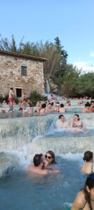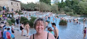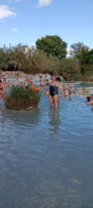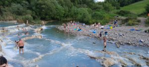 | Der Wohnmobilstellplatz Area Sosta Camper in Saturni ist ziemlich groß und man kommt über eine Schranke und ein Ticket sofort auf das Gelände fahren. Leider ist der Platz sehr abschüssig und viele Plätze sehr schräg. Wir hatten zuerst einen Platz ganz unten ohne Strom. Nach einer kurzen Zeit wurde nicht weit weg ein Platz mit Strom frei. Also schnell alles zusammengepackt und dann auf den neuen Stellplatz. Trotz Auffahrkeile konnten wir das Wohnmobil nicht genau ausrichten, aber es ging so gerade. Andere Plätze waren so schräg, dass selbst zwei oder drei Keile nicht ausgereicht hätten. Was uns sehr schwer auffiel war, dass die Plätze nicht abgeteilt waren. Deshalb stellt sich hier jeder hin, wie er gerne möchte, teilweise so, dass er zwei Plätze einnahm. Die Sanitären Einrichtungen sind schon sehr in die Jahre gekommen und könnten ein Update erhalten. Am Nachmittag sind wir dann in Richtung Thermen losgegangen. Vor uns und hinter uns eine Karawane von Menschen die auch dort hinwollten. Ca. 25 Minuten Fußweg sind es bis zu den Thermen. Der kürzeste Weg ist quer über den Stellplatz und dann den Trampelpfad bis zum großen Parkplatz und dann noch über die Straße bis zum Ziel. An den Thermen angekommen, konnten wir schon sehen das sehr viele Menschen dorthin pilgern, aber im Wasser war es wieder gut übersichtlich. Die Thermen sind schwefelhaltig, 39,5 Grad und man sollte ca. 10-20 Minuten darin verweilen. Noch einen Tipp am Rande, ich habe einen Ehering aus Weißgold und hatte diesen in der Therme an. Nachdem wir wieder am Wohnmobil waren, musste ich feststellen, dass er ganz goldfarbig durch den Schwefel geworden ist. Ich habe versucht ihn zu polieren, aber das nutzte nichts. Dann habe ich ihn mit Zahnpasta eingerieben und ca. eine halbe Stunde liegen lassen, danach gesäubert und poliert und er glänzte wieder in Silberfarbe. Mein Rat, jeglichen Schmuck am besten vorher ausziehen. Man kann zwar anschließend vor Ort noch duschen, aber dafür benötigt man entsprechende Wertmarken. Danach gings auf den Rückweg und zum gemütlichen Teil über. Bezahlt wird am nächsten Tag. Achtung, man sollte die 24 Stunden nicht überschreiten, sonst kostet es mehr. Nach- und Vorteil des Platzes ist, dass der Platz 24 Stunden geöffnet und befahrbar ist. Das heißt, das selbst nachts um 2 Uhr noch Wohnmobile ankommen, um einen Platz zu suchen oder auch wegfahren. Fazit: Die Thermen sind auf jedenfall einen Besuch wert und für eine Nacht ist der Stellplatz in Ordnung.